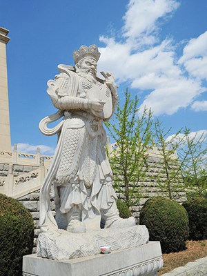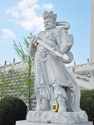 御道两侧分别坐落着两尊精美的石雕,同样,另一个御道的两侧也坐落着两尊石雕,这四尊石雕分别是增长天王、广目天王、多闻天王和持国天王,也就是人们常说的"四大天王",在传统文化中,人们把四大天王视为理想中的"天神",并赋予"风、调、雨、顺"之瑞意,以求"五谷丰登"之祥兆。(我们现在看到的左侧的这尊石雕是多问天王,也就是所说的雨,右边的这尊石雕是持国天王,也就是所说的顺;那西边御道两侧坐落的自然一个为风、一个为调。四大天王、风调雨顺,深的百姓崇敬,四大天王艺术雕塑出自问过当代著名雕塑大师、周恩来总理铜像作者、中央美术学院教授毕德林之手)。